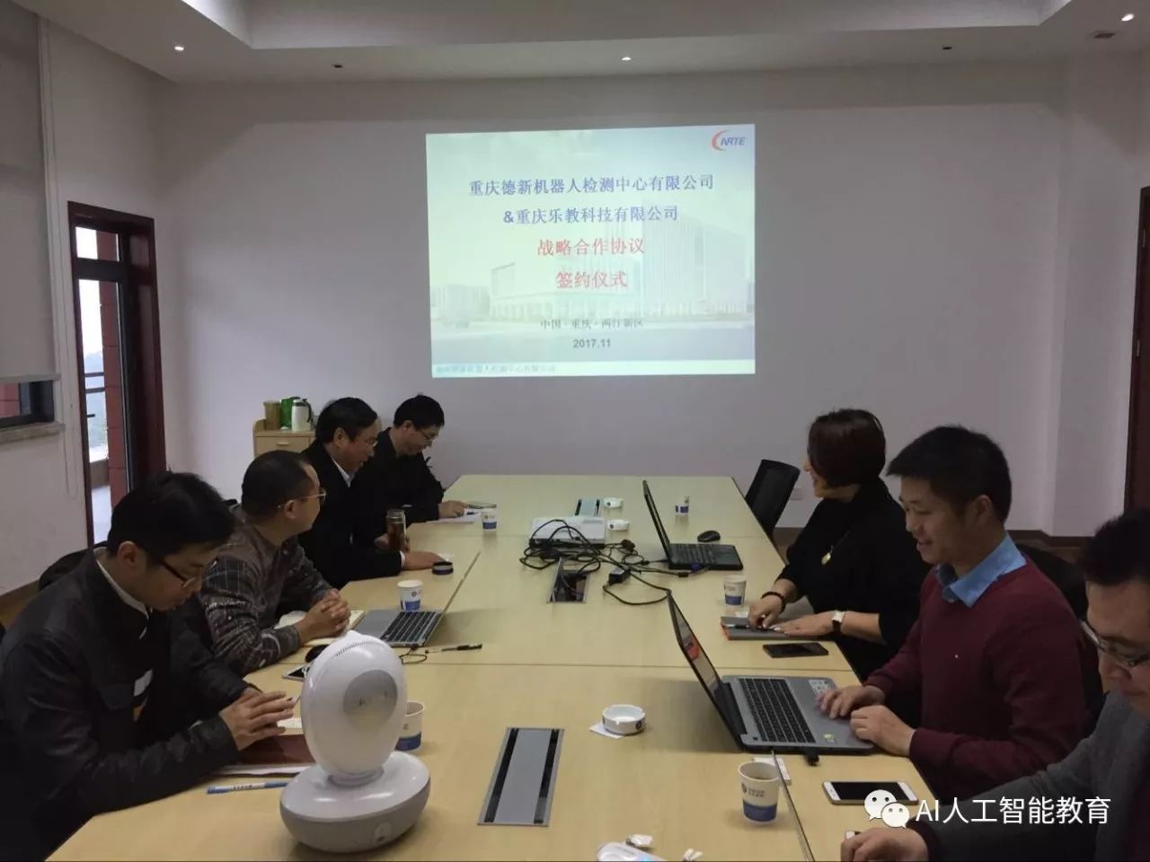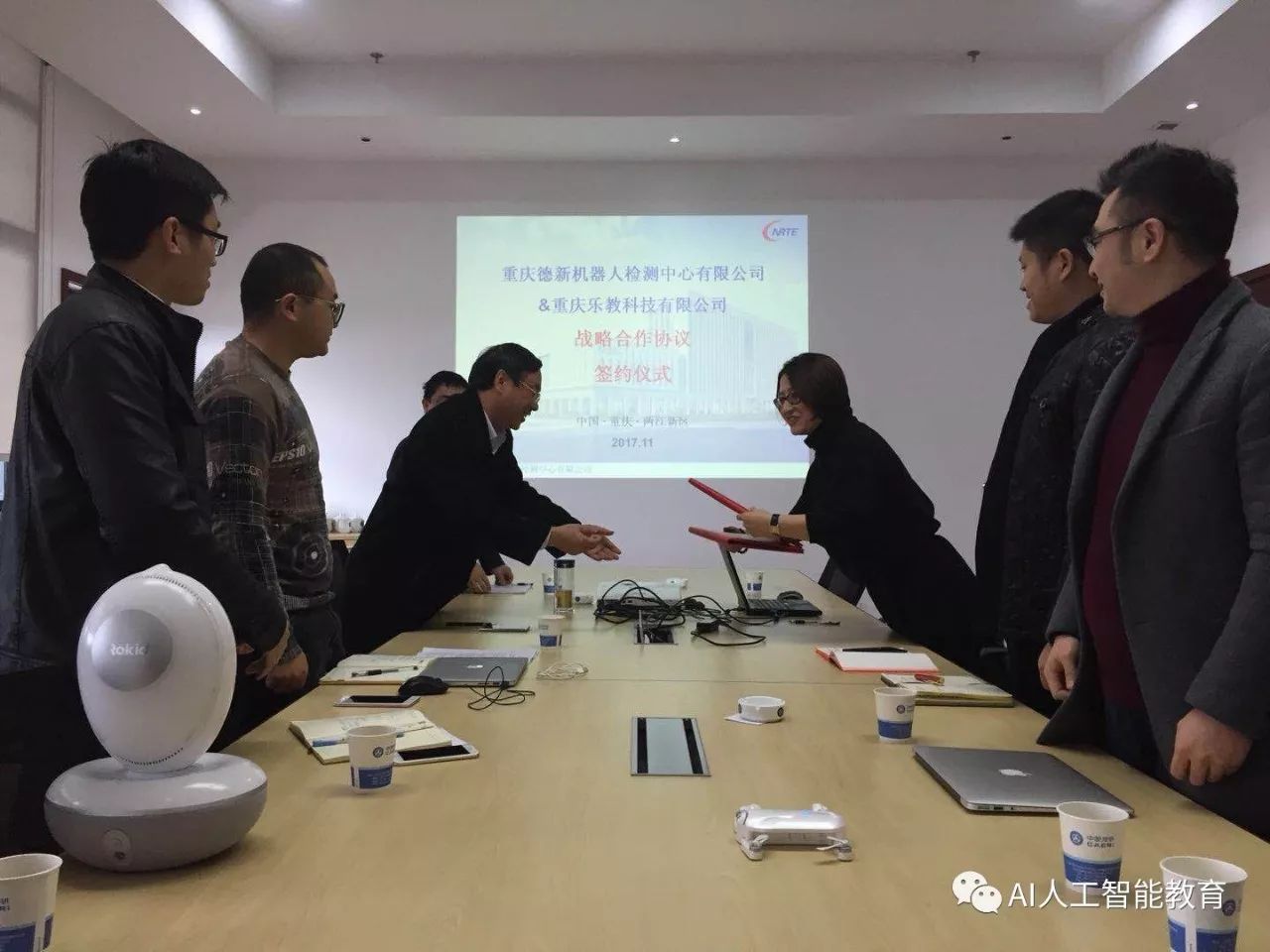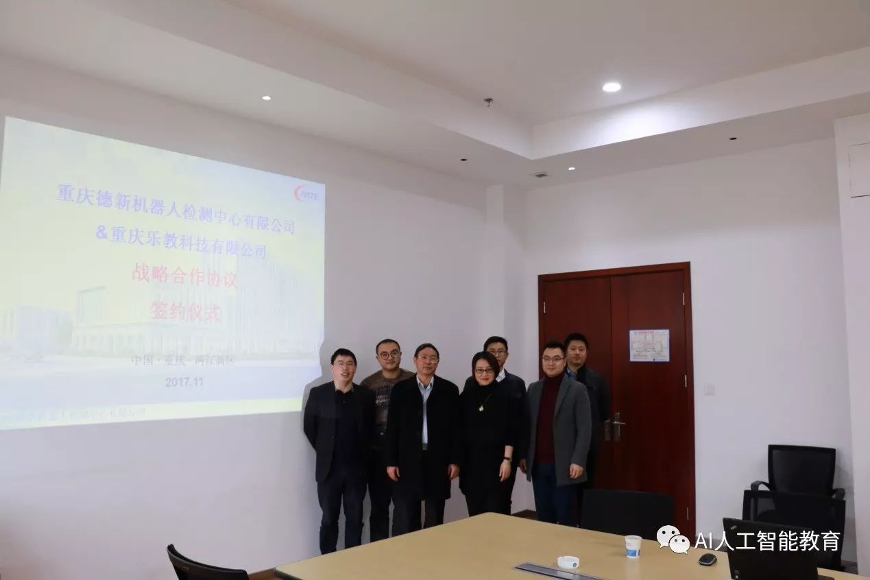 本次簽約儀式在重慶德新機器人檢測中心有限公司舉行,出席會議的有德新公司歐家??偨?jīng)理、零部件檢測部袁強部長、環(huán)境檢測部黃武凱部長、研發(fā)中心劉飛主任、服務機器人檢測部彭鵬部長、服務機器人檢測部王雨琴工程師等領(lǐng)導,樂教科技CEO張佳、副總經(jīng)理張可、副總經(jīng)理林科等領(lǐng)導,出席簽約儀式。