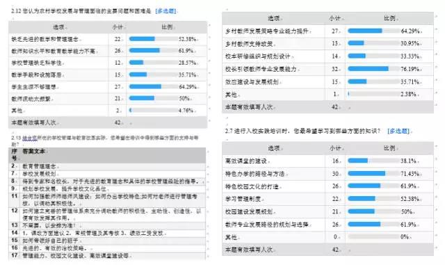 校長(zhǎng)們尚未來得及感受北京的寒意,一份訓(xùn)前調(diào)查問卷就已通過群呈現(xiàn)在他們面前。問卷中的22個(gè)問題,覆蓋了參訓(xùn)需求的方方面面。而統(tǒng)計(jì)后的調(diào)查數(shù)據(jù),也被培訓(xùn)團(tuán)隊(duì)迅速地發(fā)給了每一位授課專家。專家們則通過數(shù)據(jù),更精確地調(diào)整課程內(nèi)容和講授方式。