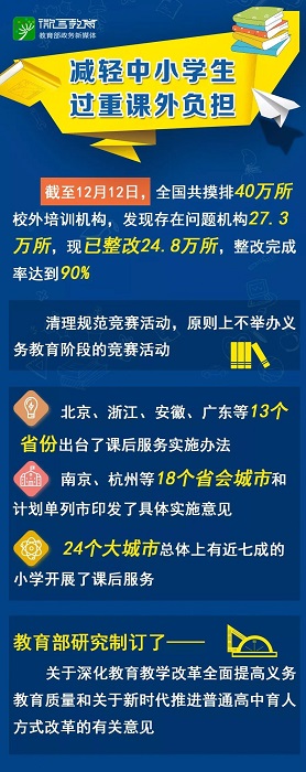 為推進綜合治理,教育部正會同有關部門研究制定中小學生綜合減負措施,明確各方責任,形成政府、學校、校外培訓機構(gòu)、家庭協(xié)同推進減負工作合力。呂玉剛表示,下一步,要進一步加大校外培訓機構(gòu)治理力度,切實解決校外培訓機構(gòu)存在安全隱患、無證無照、超標超前教學等突出問題,確保年底前完成集中整改工作。在此基礎上,強化督導檢查,鞏固治理成果,堅決防止反彈,建立健全校外培訓機構(gòu)規(guī)范有序發(fā)展的長效機制,使校外培訓走上制度化、規(guī)范化管理軌道,真正成為學校教育的有益補充,促進中小學生全面健康發(fā)展。