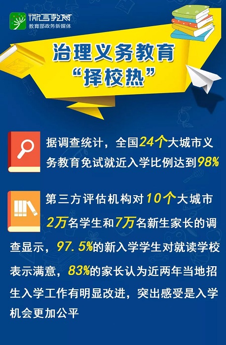 據(jù)調(diào)查統(tǒng)計,第三方評估機構(gòu)對10個大城市2萬名學生和7萬名新生家長的調(diào)查顯示,97.5%的新入學學生對就讀學校表示滿意,83%的家長認為近兩年當?shù)卣猩雽W工作有明顯改進,突出感受是入學機會更加公平。