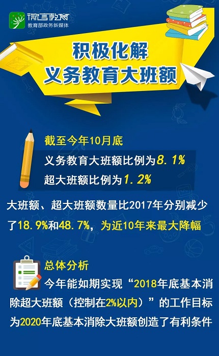 截至今年10月底,義務教育大班額比例為8.1%,超大班額比例為1.2%。大班額、超大班額數(shù)量比2017年分別減少了18.9%和48.7%,為近10年來最大降幅。