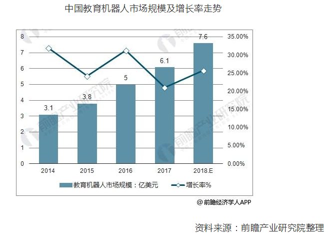 據(jù)前瞻產業(yè)研究院發(fā)布的《中國教育機器人行業(yè)發(fā)展前景預測與投資規(guī)劃分析報告》數(shù)據(jù)顯示,2017年中國教育機器人市場規(guī)模為6.1億元,同比增長21.1%,隨著國家政策大力扶持人工智能中小學落地,預計中國教育機器人市場將持續(xù)穩(wěn)定增長,預計2018年中國教育機器人市場規(guī)模將達到7.6億元,增長率為25.8%。