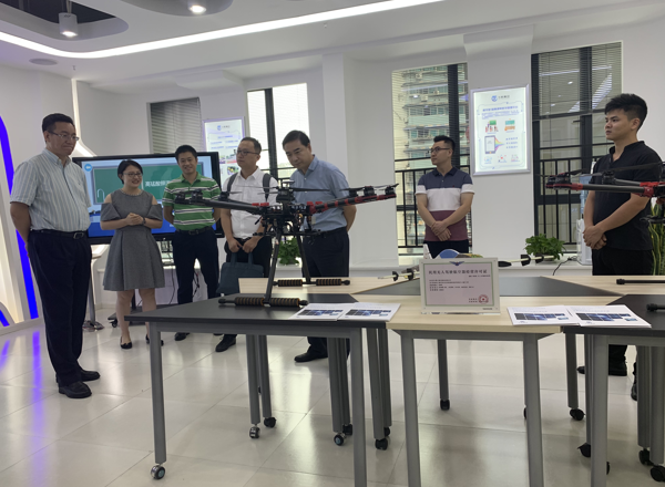 林總為領(lǐng)導(dǎo)們講解有關(guān)無(wú)人機(jī)教育與應(yīng)用服務(wù)領(lǐng)域、智能教育、人工智能課情分析系統(tǒng)、虛擬學(xué)習(xí)平臺(tái)等。