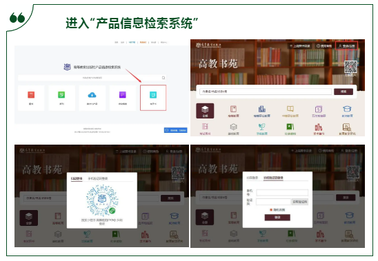 輸入網(wǎng)址http://xuanshu.hep.com.cn/,進(jìn)入“產(chǎn)品信息檢索系統(tǒng)”首頁,點(diǎn)擊右側(cè)“電子書”模塊,進(jìn)入電子書界面,點(diǎn)擊右上角“登錄/注冊(cè)”按鈕,選擇“掃碼登錄”或“手機(jī)驗(yàn)證碼登錄”。①“掃碼登錄”操作步驟:通過微信“掃一掃”掃描頁面上的小程序碼,新用戶登錄請(qǐng)點(diǎn)擊微信界面“微信授權(quán)”→“允許”高教社用戶中心申請(qǐng)→“授權(quán)使用手機(jī)號(hào)”→“允許”高教社用戶中心使用→“確認(rèn)登錄”;老用戶直接點(diǎn)擊微信界面的“確認(rèn)登錄”。