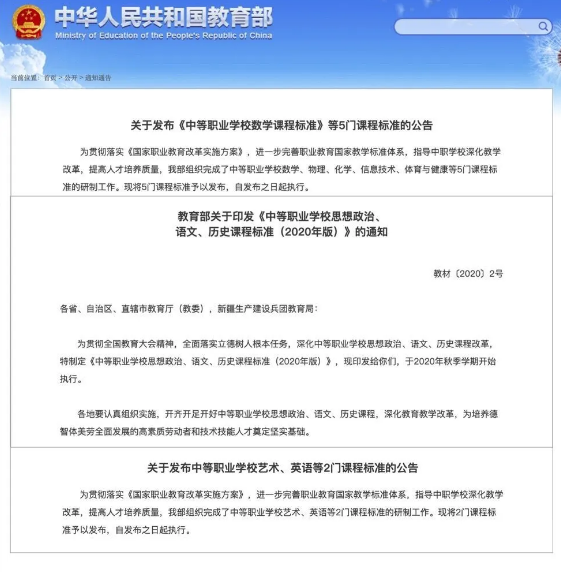 近期,教育部陸續(xù)頒布了中等職業(yè)學校思想政治、語文、歷史、數(shù)學、英語、信息技術(shù)、體育與健康、物理、化學、藝術(shù)10門公共基礎(chǔ)課的課程標準。為貫徹落實《國家職業(yè)教育改革實施方案》《關(guān)于加強和改進新形勢下大中小學教材建設(shè)的意見》,落實立德樹人根本任務(wù),深化中等職業(yè)學?!敖處煛⒔滩?、教法”改革,幫助廣大學校和教師更好地領(lǐng)會并掌握各科課程標準,決定開展中等職業(yè)學校10門公共基礎(chǔ)課課程標準培訓。