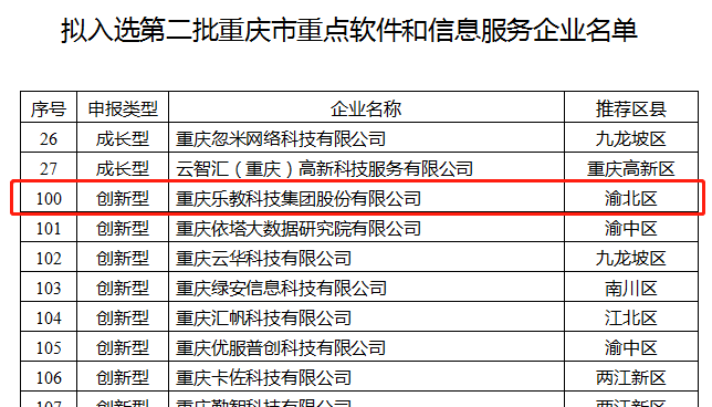 樂教科技集團經(jīng)申報,各區(qū)縣經(jīng)濟信息委(含經(jīng)信主管部門)審核推薦及專家評審,入選第二批重慶市重點軟件和信息服務(wù)企業(yè)。
